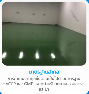บริการติดตั้งและจำหน่ายระบบเคลือบพื้นโรงงานอุตสาหกรรมทุกประเภท ด้วยทีมงานมืออาชีพ ประสบการณ์กว่า 10 ปี รับประกันคุณภาพตามมาตรฐาน HACCP และ GMP